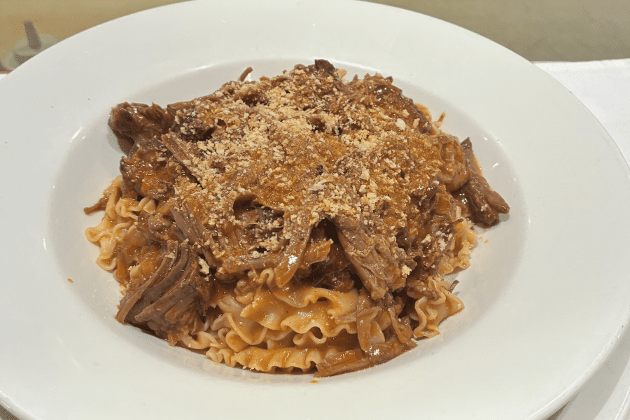 Mafalda pasta with slow-braised short rib ragù garnished with pangrattato