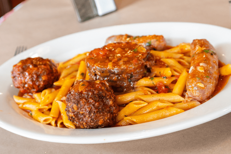 Your choice of pasta with braciole, sausage and meatballs in gravy
